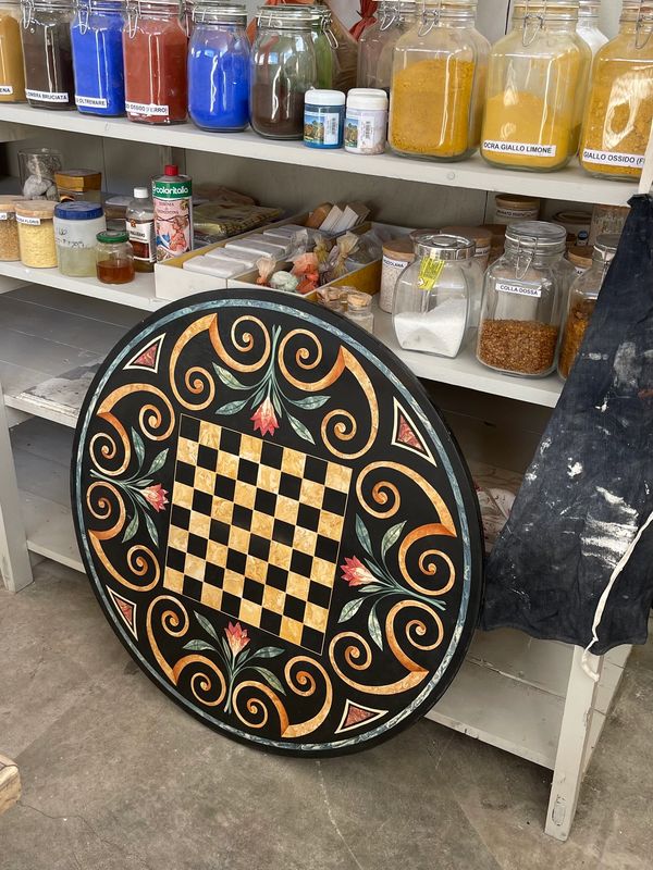 Its very particular processing is done entirely by hand as it does not allow the use of electric machinery, because in the polishing phase, which occurs through abrasion, a tiny impurity could scratch and compromise the entire work cycle. The steps are: Mixing, Spreading, Granulating and shaping, filling, sanding, drying, oiling, and waxing. It is possible to inlay the surface creating logos, designs, and reproductions of various kinds.